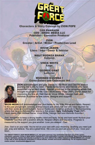 NKOSI MEDIA LLC acknowledges and give thanks to: My Wife, friends and family. Respectto the past and present, activists, entrepreneurs and artists I%u2019ve met who have inspired mewith their works and contributions. Special thanks and immense gratitude to the hardworkingartists that have contributed their talents to this project; Gary %u2018HulkDaddy%u2019 Pope (RIP).David Jaxon, Walt Msonza Barna, Vince White, George Gant and Mshindo Kuumba I.Zion, remember to keep a strong healthy mind and body. Study and hard work! Nurture yourcreativity! Sacrifce with a positive attitude. Respect others and your time. Progress Ismeasured by the support you give another. Love you always! - Dad.Zion, God is on your side. You%u2019re not on your own with your dreaming; anything you need justask, pray and believe. You are a great force. We Love you and are proud of you. I love you! -Mom.The GREAT FORCE %u00a9 2020 NKOSI MEDIA LLC. All rights reserved. Any similarities between any of the names,characters, persons; living or dead and/or institutions in the publication is purely coincidental. None of the publicationmay be reprinted, copied, reproduced or quoted in any form without the written consent of NKOSI MEDIA LLC, exceptin the case of brief quotations embodied in critical articles, reviews and social networking. For all inquires and/ormedia contact: nkosimediallc@gmail.comZION acknowledges and give thanks to: My Mom and Dad for alwayspushing me to be my best. Thanks to my family and friends who havesupported my art and ideas. Special shout-out to the amazing artists thatbrought my project to life; Gary %u2018HulkDaddy%u2019 Pope (RIP), David Jaxon forimproving my line art,Walt Barna, Vince White, George Gant andMshindo Kuumba for the colors, designs and support!